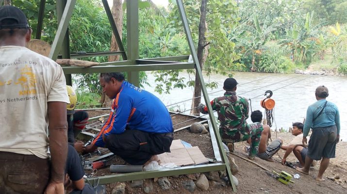 Kab. Semarang – para Prajurit Babinsa Kodim 0714/Salatiga bersama dengan komunitas Rubicon Off Road dan masyarakat bersinergi bersama untuk membangun jembatan gantung di Dusun